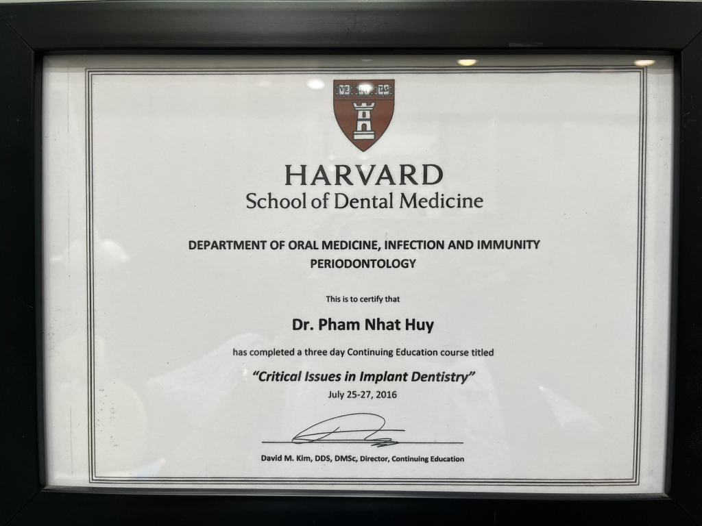 Điển hình, vào tháng 7 năm 2016, Bác sĩ Huy đã có cơ hội tham gia và hoàn thành khóa đào tạo liên tục tại Đại học Harvard – một trong những ngôi trường danh tiếng nhất thế giới – để nâng cao kiến thức về Implant Nha Khoa.