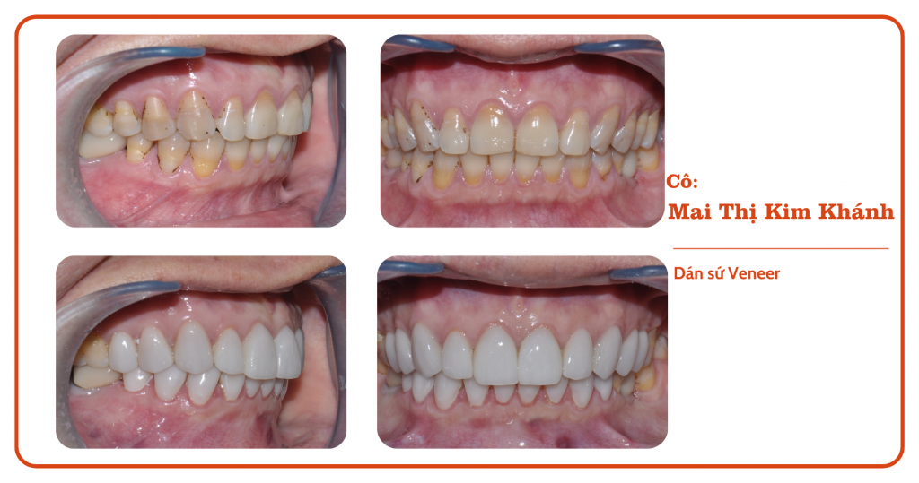 Răng bị nhiễm màu, có vết dính đã được cải thiện nhờ phương pháp dán Veneer sứ giúp thay đổi hình dáng và màu răng khôi phục thẩm mỹ cho chi Khánh. Dán Veneer sứ là phương pháp điều trị xâm lấn tối thiểu, hạn chế mài răng và không gây ê buốt.